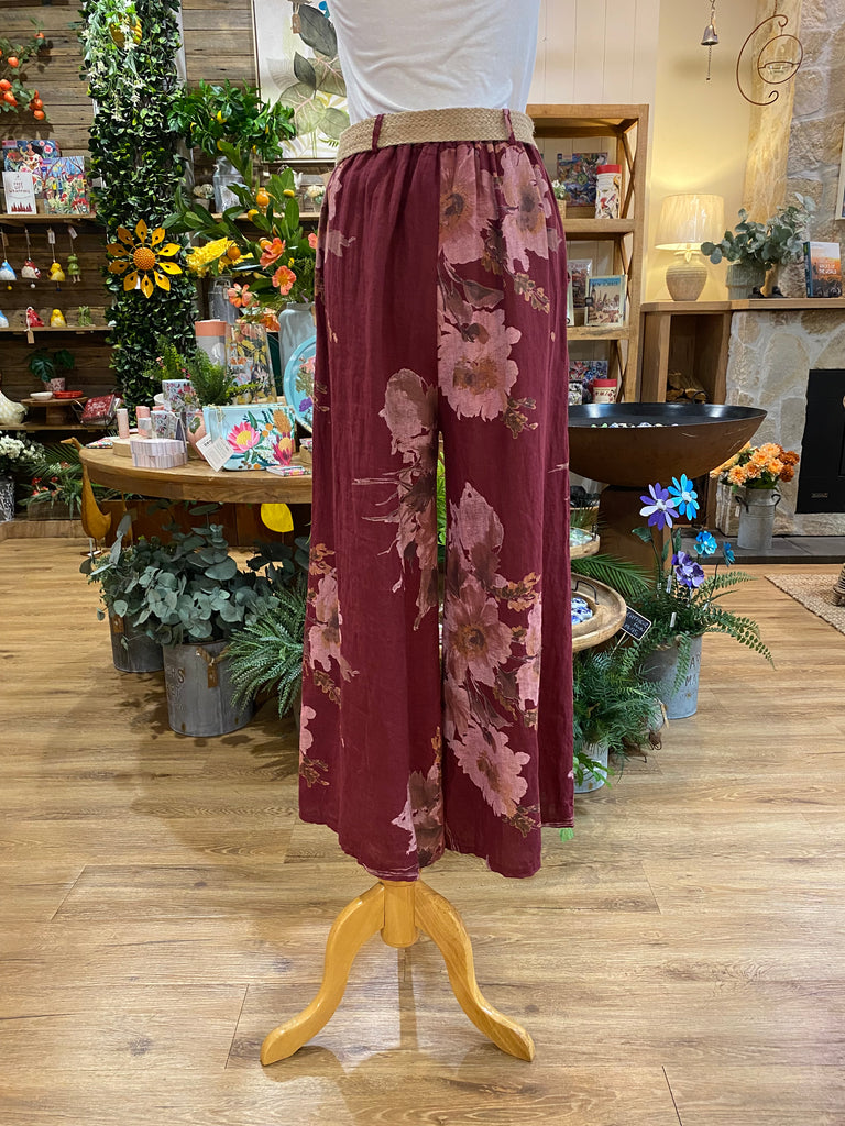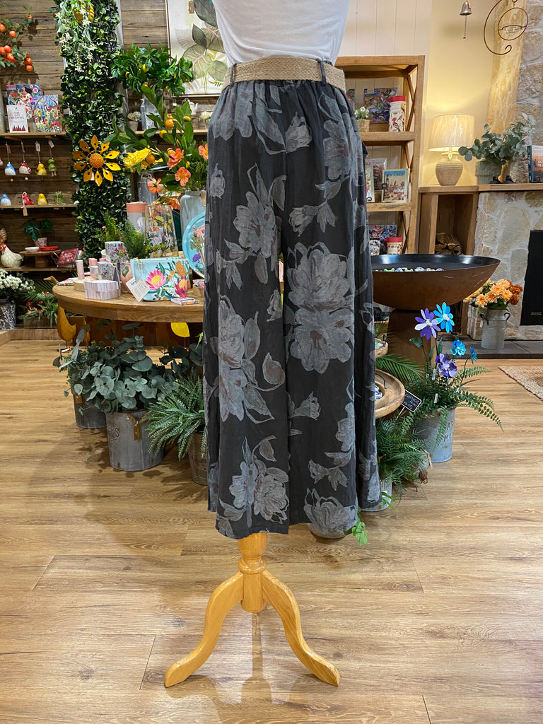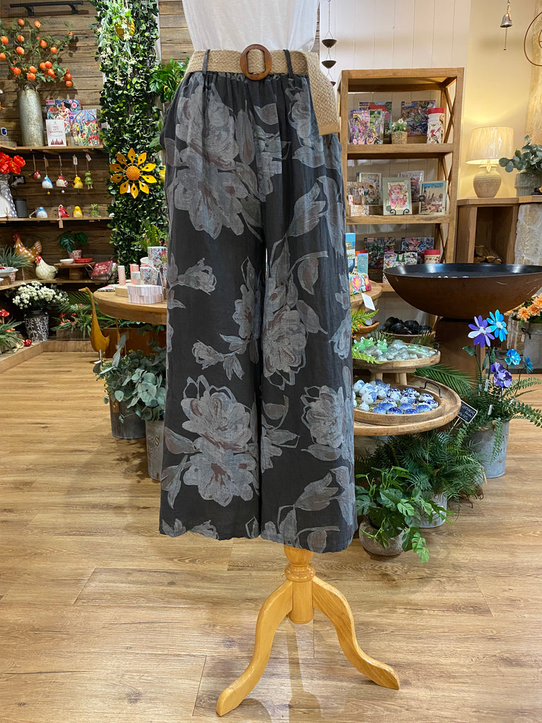 Relaxed wide leg fit with elastic waist, elegant floral design and woven belt; 2 color options. |